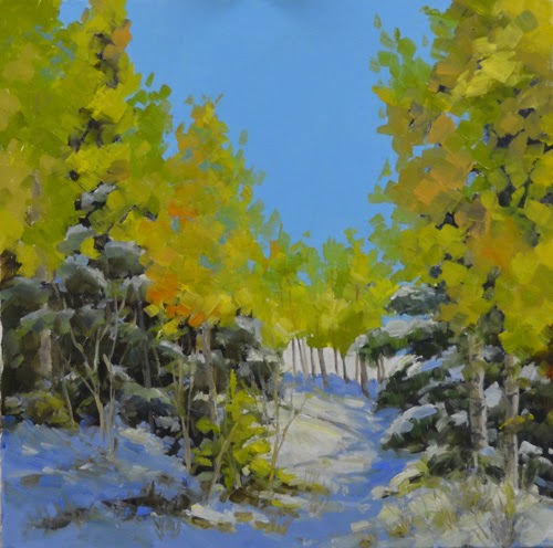 Aspen Tree Colorado Winter Landscape oil Painting "Early Arrival" by Western Colorado Artist Barbara Churchley